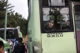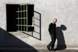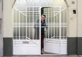 A resident of the house where the movie Roma was filmed watches gawkers outside his door.